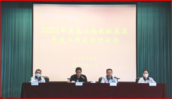 為深入貫徹落實新時代黨的建設總要求和黨的組織路線,全面總結回顧泰達熱能2022年基層黨建工作情況,持續加強基層組織建設,進一步提高公司黨建工作水平,3月1日,泰達熱能召開2022年度抓基層黨建工作述職評議會。泰達實業黨委組織部高姝婷同志視頻列席會議,泰達熱能黨委班子成員、黨委黨建工作領導小組成員、泰達控股黨代表、各支部書記、黨員代表、群眾代表共計80余人參加會議。