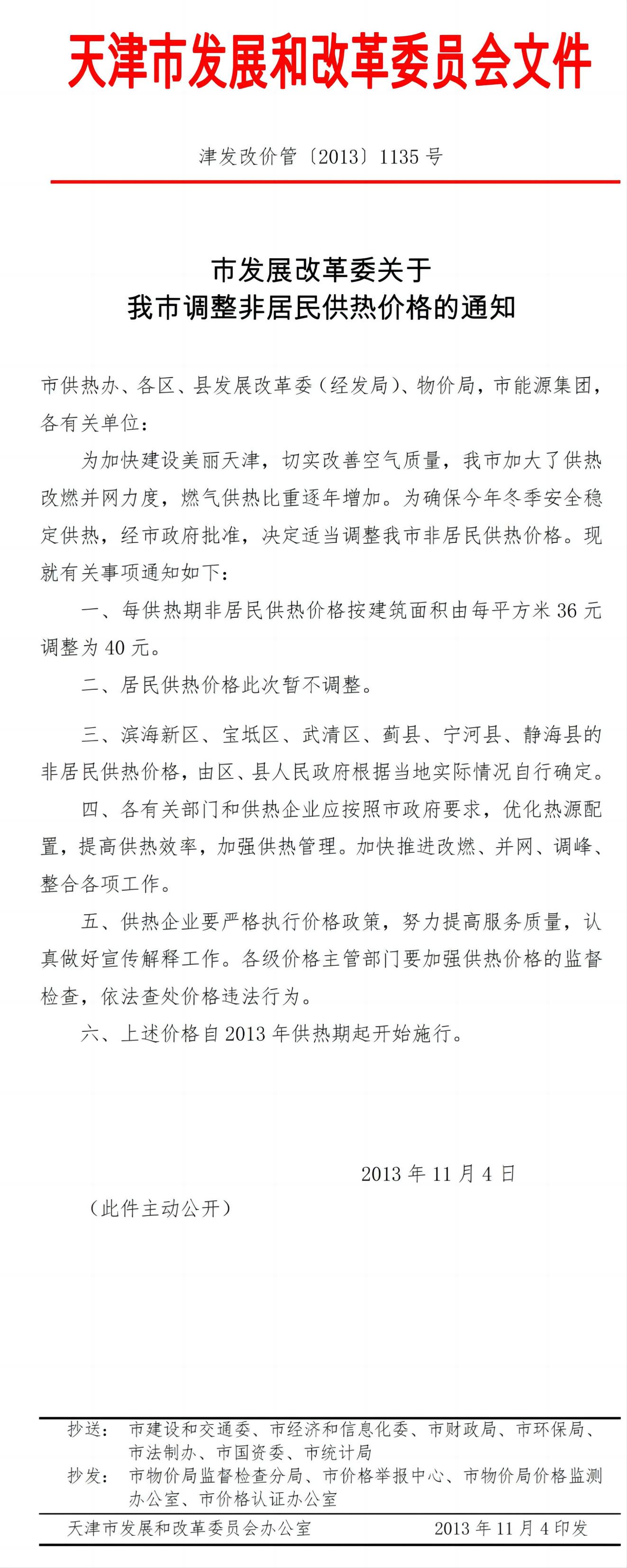 《市發(fā)展改革委關(guān)于我市調(diào)整非居民供熱價(jià)格的通知》(津發(fā)改價(jià)管[2013]1135號)