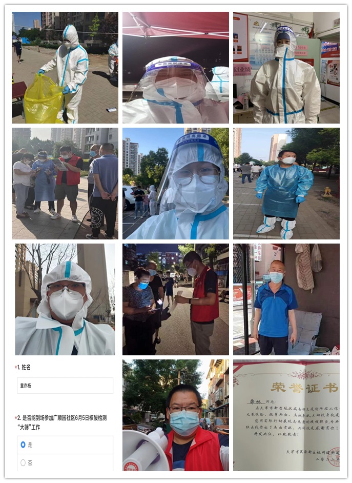 從5月15日到6月5日期間,27名泰達熱能人投身到天津各個社區的核酸篩查現場,從溫暖守護者變成“大白”、“藍精靈”和“紅馬甲”,他們在工作人員安排下融于核酸篩查的各個環節。他們有的成為“掃樓員”,挨家挨戶開展“敲門行動”,提醒居民們下樓做核酸;他們有的成為“秩序維護者”,一遍又一遍提醒大家保持一米間距戴好口罩,引導疏散居民;他們有的成為“信息錄入小助手”,幫助現場老年人掃碼注冊登記,完成居民信息錄入。